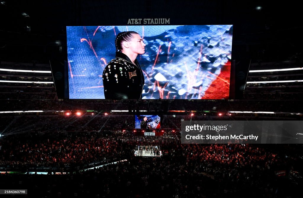 Amanda Serrano (izquierda) y Katie Taylor (derecha) e intercambian golpes durante sus títulos mundiales superligeros del Campeonato de Boxeo Premiere el viernes por la noche en el estadio AT&T en Arlington, Texas, Estados Unidos, el 15 de noviembre de 2024. (Foto de Tayfun Coskun/ Anadolu vía Getty Images)