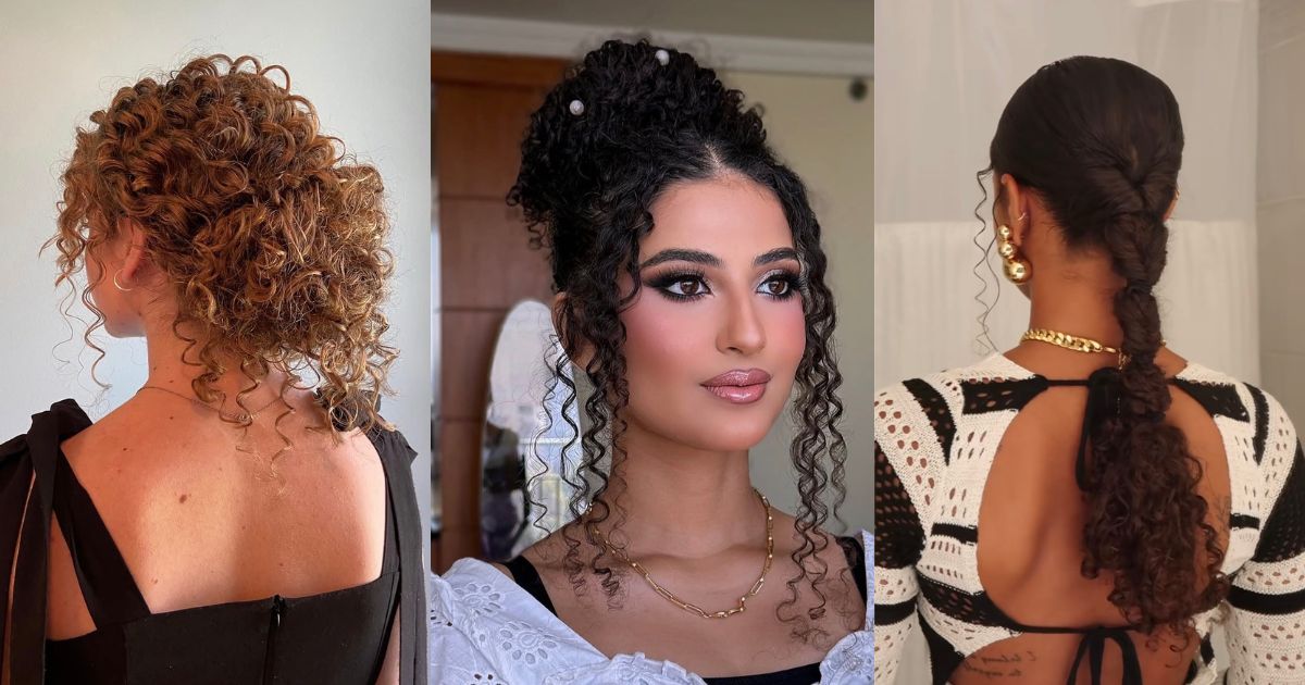 Peinado con rizos definidos en media coleta alta, con mechones sueltos al frente que enmarcan el rostro y dan un toque romántico. Ideal para eventos o looks elegantes pero naturales.