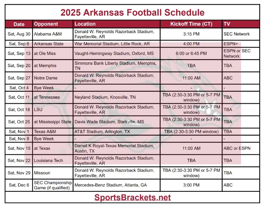 2025 horario de fútbol de Arkansas; Imprimible, enfrentamientos y televisión