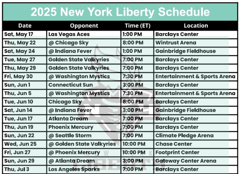 El 2025 Horario de la libertad de Nueva York Realiza desde mediados de mayo hasta septiembre de 2025. No solo obtenemos 44 juegos esta temporada, sino que veremos más y más juegos de Liberty en la televisión esta temporada al igual que el Horario de Indiana FeverTodos estarán ansiosos por ver al equipo ir contra Caitlin Clark y al equipo en casa por primera vez el 16 de julio de 2025 esta temporada. También obtenemos el segundo enfrentamiento en casa contra el Aces de Las Vegas el 8 de julio de 2025.