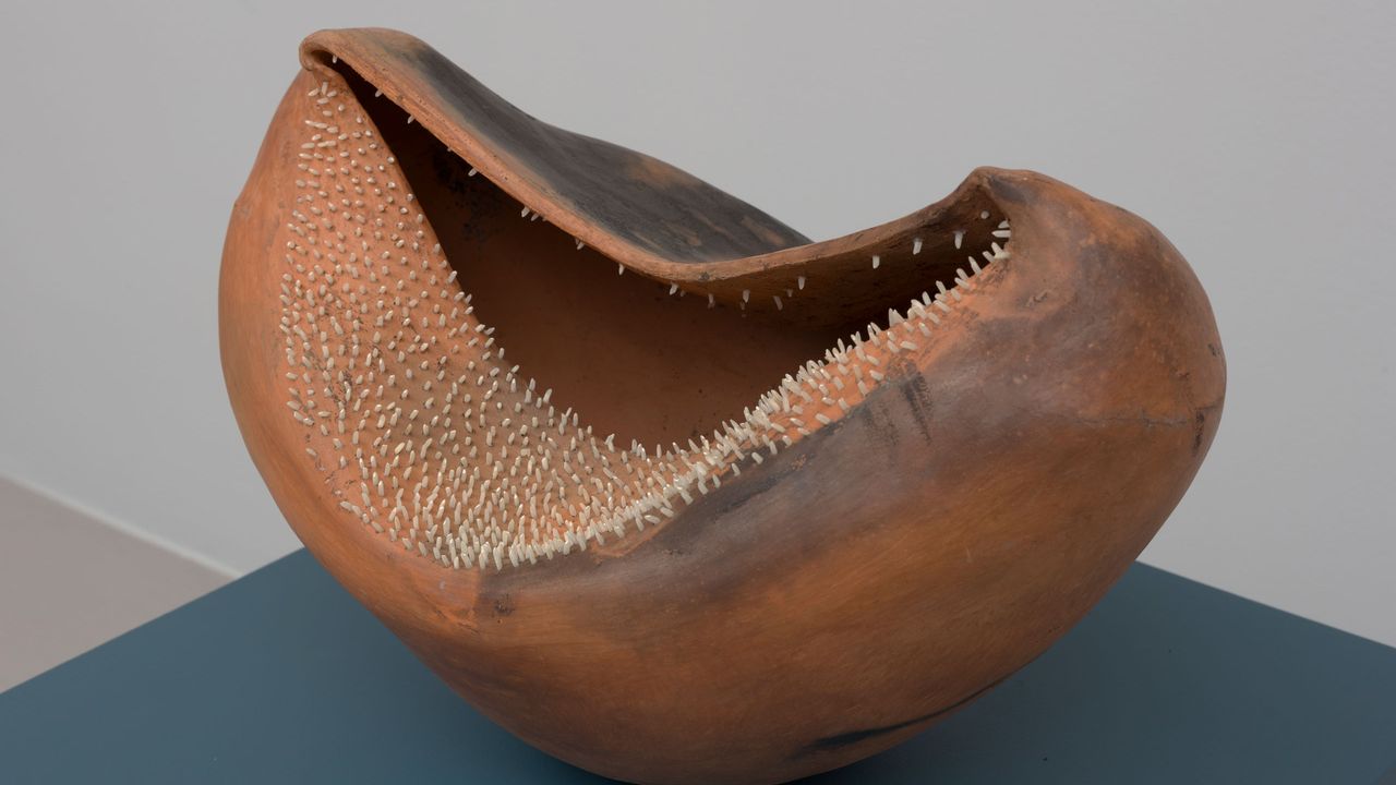 No sabía de la historia familiar de Gbadebo cuando visité su show en solitario, «Cuidado con los fantasmas» (una referencia al poema épico de Amiri Baraka «Why's/Wise»), en la Galería Nicola Vassell, a principios de septiembre. Pero había sentido una inquietud en la atmósfera que duró mucho después y finalmente cristalizó en algo duro y real. El efecto posterior del espectáculo fue de sentimiento. . . pinchado. Las sensaciones subieron el brazo. Touch es el sentido subordinado en la galería, activado, en este programa, debido a las superficies de Gbadebo. Pero la sensación de fantasma tarda un minuto en registrarse. Desde la distancia, el análisis proviene del ojo, que está encantado con las bocas abiertas, las ondulaciones en la base que sugieren piadosamente la tradición de honrar la forma femenina. Los recipientes, sentados en zócalos de color verde azulado, son objetos atemporales. Pero, a medida que te acercas, la concentración de energía cambia de forma a «piel» y espacio negativo. Este es un drama completamente diferente. Gbadebo llena, por ejemplo, un contenedor que evoca una escultura devocional de fertilidad con montículos de arroz. La agradable boca ancha ahora se ve, tras una inspección más cercana, como un agujero sin fondo, el arroz, como las larvas, reproduciendo sin cesar. En otra parte, Gbadebo individualiza los granos, incrustándolos en la piel exterior de los vasos, por lo que se mantienen erguidos y extrusivos. En otra pieza, sobresalen como dientes. Se reclutan otros materiales orgánicos en su arte de medios mixtos, su obra en un tabú de lo que constituye «material»; cabello humano, caballo, agujas de pino, semillas, hueso de animales, rama de cerezo. Entonces, en cierto sentido, en esta sala, los vasos funerarios están vivos: la historia está viva.