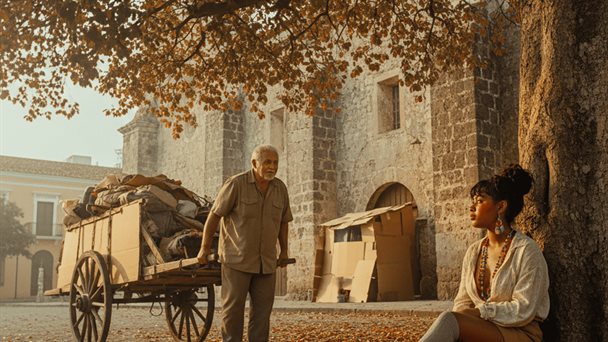 La remozada pordiosera esperaba, recostada en el tronco, algo… o alguien en la solitaria tarde, minutos pasados ​​las tres. Cruzaba las piernas y cambiaba todo el cuerpo de posición este a oeste y viceversa. Como entorno inmediato los altos muros de la Iglesia, la otrara local de la Academia de la Historia y la casa de las hermanas Henríquez en la que luego funcionará el Liceo Dominicano. Las tres y quince y no pasa nada. De una vieja cartera saca nuestra protagonista un estuche compacto y se reafirma el carmín de los cachetes. Más de las tres y veinte era, cuando surge un uniforme sonido de arrastre metálico: primero débilmente y luego como lluvia que empieza a llegar. Desde la Sánchez, en contravía y doblando finalmente a la calle Las Mercedes, también en vía contraria, se acerca una enorme carretilla, ancha, alta, de tablones y ruedas combinadas de velocípedo y de cojinetes; detrás, un corpulento anciano…mejor ¿envejeciente? sirve de efectivo motor impulsándola sin mucho esfuerzo. Alcanza a distinguir, desde que gana la esquina, a la dama solitaria y continúa ligero hasta quedar carruaje y conductor justo frente a ella. La contempla sin palabras mientras ella, sabiéndose objeto de atención, tras una breve mirada voltea la vista hacia un punto indefinido.