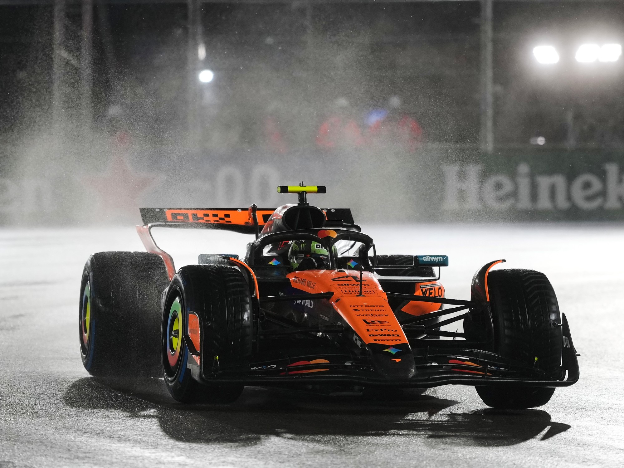 Con una pista mojada y que obligó a los pilotos a usar -por primera vez esta temporada- los neumáticos full wet (azules) en la Q1 y en la Q2, se fue la clasificación del Gran Premio de Las Vegas en la Fórmula 1 este sabado. Y el poleman, como en las últimas dos carreras y por 16° vez, fue Lando Norrisde McLaren, con 1m47s934, superándolo sobre el final de una Q3 -que ya tuvo a todos con intermedios- a Max Verstappen (Red Bull), quien quedó en el segundo lugar con 1m48s257. El podio lo cocinó Carlos Sainz (Williams), con 1m48s296.