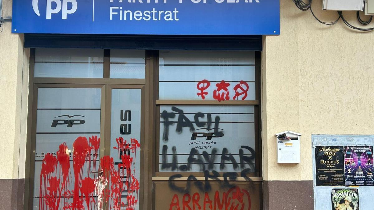 La sede del PP en la localidad alicantina de Finestrat ha sufrido un ataque con pintura roja vertida sobre su fachada y pintadas registradas la pasada noche, según ha informado en un comunicado el Partido Popular de la Comunitat Valenciana (PPCV). En las pintadas, en negro y rojo, se puede leer en valenciano”Fàcil llavar cuida Arran La Marina”.