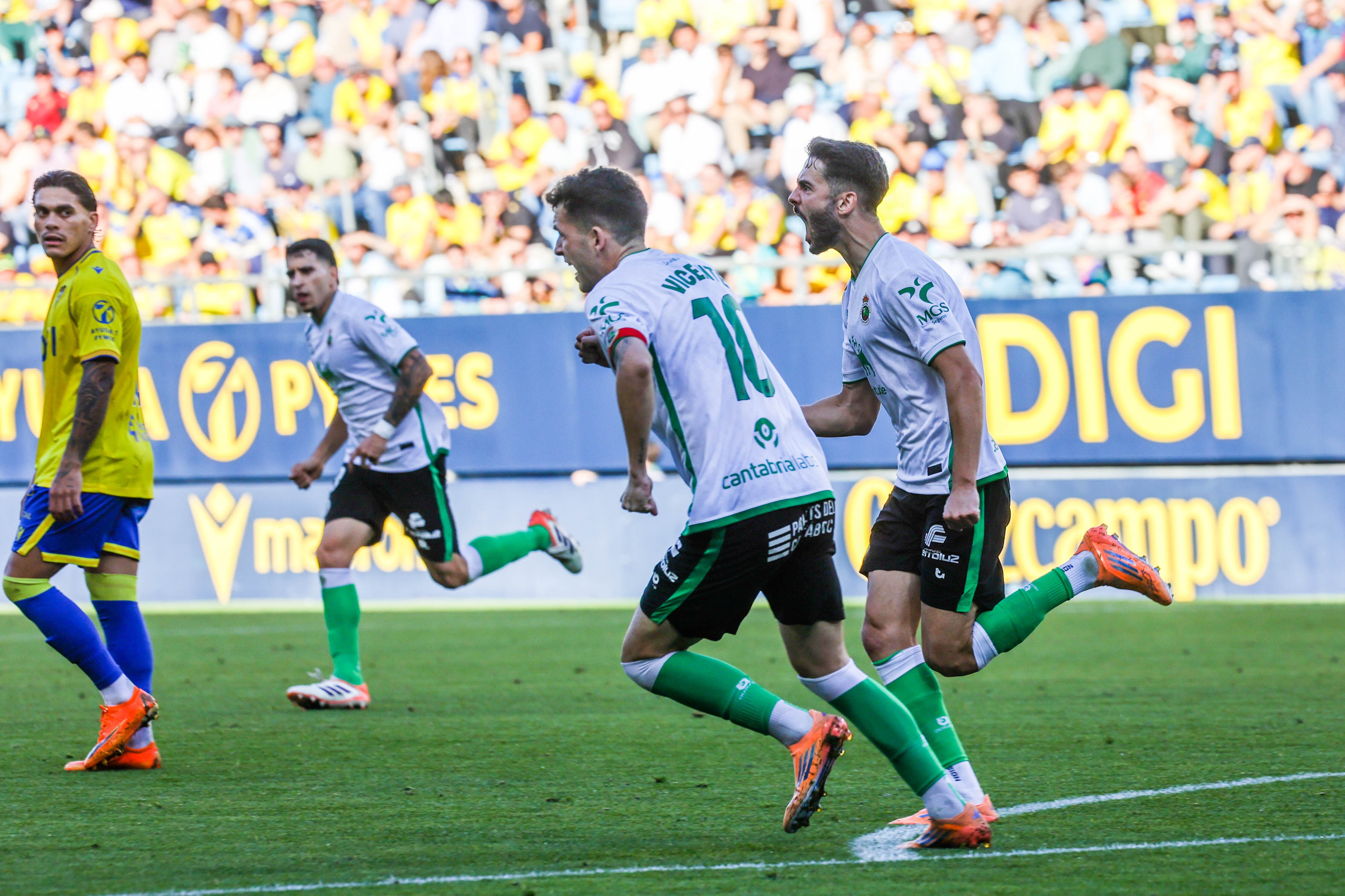 El Cádiz se impone en una primera mitad frenética. Los de Garitano golpearon pronto con los tantos de camaraculminando un gran centro de De la Rosa, y de Roger Martí tras un recace de Ezkieta. Pese al mazazo, el Racing reaccionó y recortó con un golazo de Íñigo Vicenteque ajustó a la escuadra tras un control sobresaliente. El conjunto cántabro mejoró con el balón, pero sufrió ante la presión alta de un Cádiz muy agresiva y vertical, que generó varias ocasiones claras y obligó a Ezkieta y Víctor Aznar a intervenir con paradas de mérito. Primer parte áspera, cargado de amarillas y ritmo, y aunque el Racing presionó en el tramo final del primer acto, el Cádiz sostiene su ventaja rumbo al descanso.