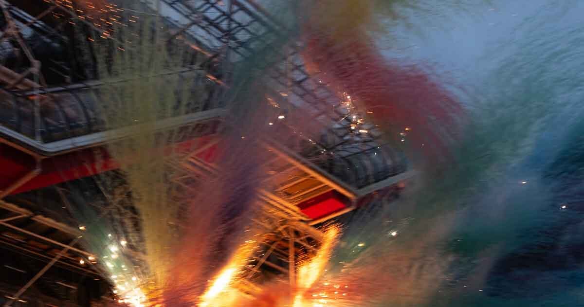 Desde la plaza de Beaubourg, la familiar maraña de conductos, vidrio y acero sirvió como telón de fondo y participante. El humo se enroscaba alrededor de las pipas de colores. Los pigmentos en polvo flotaban en el aire. El museo que siempre había revelado su funcionamiento interno (sus escaleras mecánicas, sus respiraderos, su columna pública) se convirtió por un breve tiempo en una superficie para pintar con fuego. Vea la cobertura de designboom sobre dónde encontrar las exposiciones temporales y permanentes del Centro Pompidou durante su cierre aquí.
