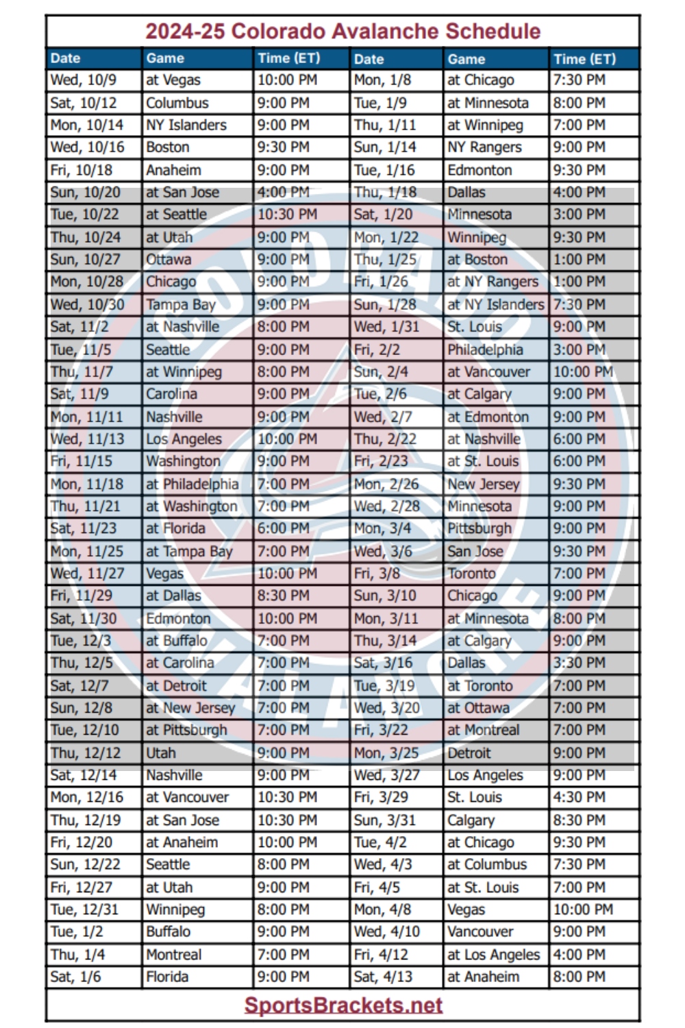 El calendario 2024-25 de Colorado Avalanche comienza el 9 de octubre como visitantes contra Vegas Golden Knights. El partido inaugural de local de Avalanche será el 12 de octubre contra Columbus. Todos los partidos de Colorado están incluidos aquí y en formato PDF. El último partido de la temporada regular de la NHL de Avalanche será como visitantes el 13 de abril contra Mighty Ducks.