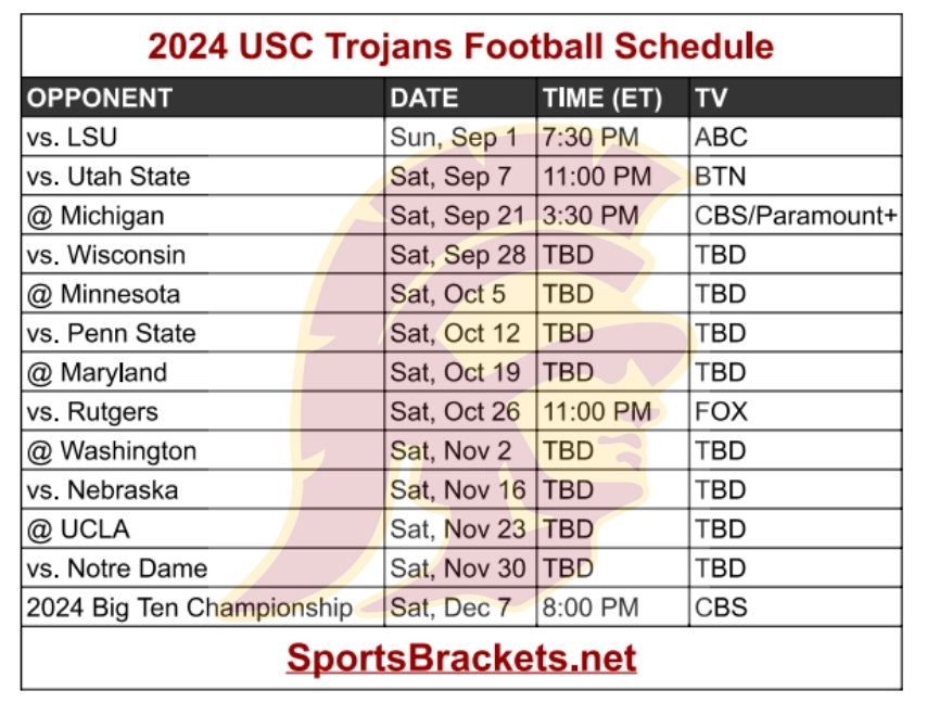 Tenemos el calendario de fútbol americano de la USC 2024 para imprimir en formato PDF e imagen para ti. Los Trojans de la USC comienzan la temporada en casa contra LSU el 1 de septiembre. Esta es la primera temporada de los Trojans en la Big Ten, por lo que hay muchos oponentes nuevos en el calendario para esta temporada. La USC juega como visitante contra los antiguos equipos de la PAC-12, Washington y UCLA, esta temporada. La USC cierra la temporada con su partido anual contra Notre Dame en casa el 30 de noviembre de 2024.