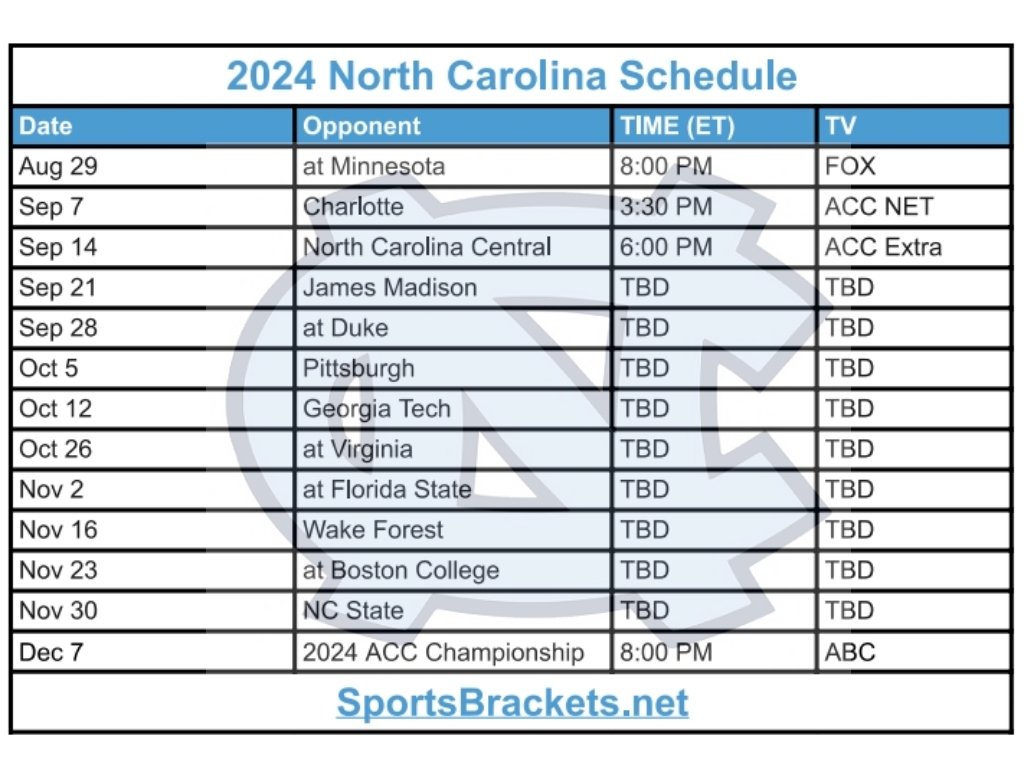 Tenemos el calendario de fútbol americano de Carolina del Norte 2024 para imprimir en formato PDF e imagen. Los Tar Heels comienzan la temporada como visitantes contra Minnesota el 29 de agosto. Su primer partido en casa es el 7 de septiembre contra Charlotte. Los Tar Heels concluyen la temporada regular de fútbol americano universitario de 2024 el 30 de noviembre en casa contra NC State.