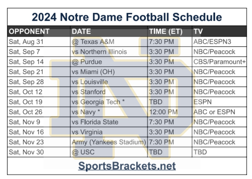 Siempre me resulta más fácil seguir la acción con un 2024 imprimible. Fútbol de Notre Dame Horario. Tenemos uno publicado para ti en Formato PDF y como imagen arriba. No dudes en compartirlas y usarlas como creas conveniente. Una vez que tengamos los detalles sobre el juego de la USC, te informaremos.