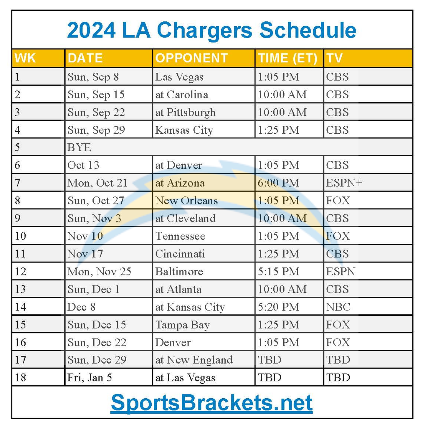 El calendario imprimible de Los Angeles Chargers 2024 está disponible en formato PDF y de imagen. El calendario de la temporada de 17 juegos incluye todos los enfrentamientos y transmisiones televisivas, y los detalles de la Semana 18 se determinarán más cerca de la fecha. Los Chargers comienzan su temporada regular de la NFL 2024-25 el 8 de septiembre con un partido en casa contra Las Vegas Raiders.