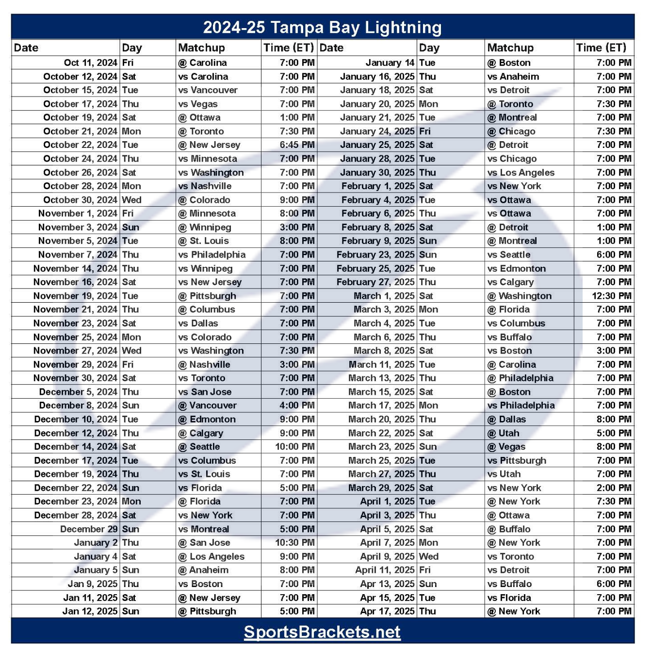 El calendario 2024-25 de los Tampa Bay Lightning comienza el 11 de octubre con un partido de visitante contra los Carolina Hurricanes. El último partido de la temporada regular 2024-25 será el 17 de abril, cuando se enfrentarán a los New York Rangers de visita. El último partido de local de los Lightning será el 15 de abril contra los Florida Panthers.