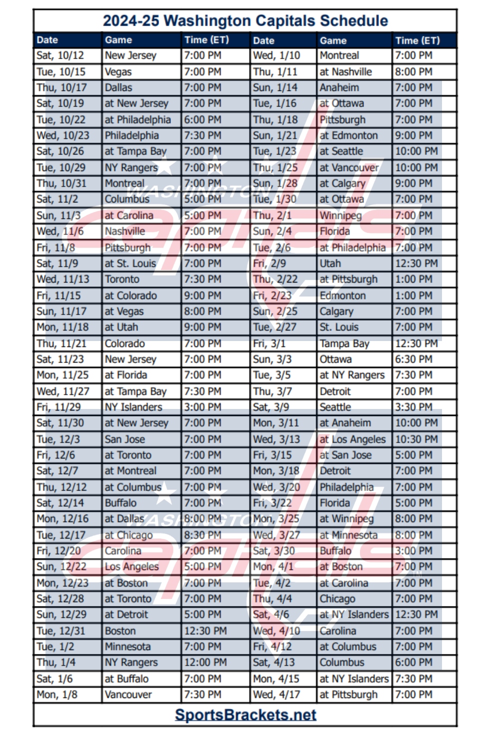 Si realmente quieres seguir el Capitales Esta temporada, descubrí que obtener un calendario imprimible de Washington Capitals para 2024-25 es clave. Tenemos el calendario listo en PDF. Todos los horarios que se indican corresponden a la hora del este (EE. UU.). Tenemos la información completa calendario imprimible de la nhl de todos los equipos también. Si quieres ver cuándo juegan Washington y otros equipos en el Pretemporada de la NHLTenemos todos esos horarios publicados para que los uses para seguir la acción, así como también todas las Partidos inaugurales en casa de la NHL en 2024.