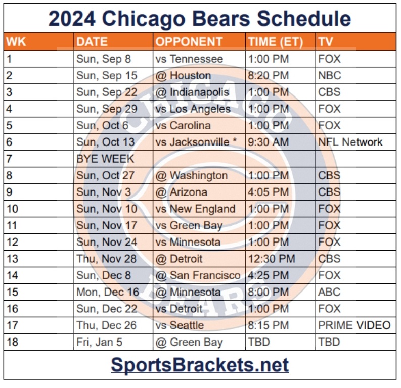 En mi experiencia, definitivamente es más fácil tener un calendario imprimible de los Chicago Bears 2024 para seguir la temporada. El calendario está en formato de imagen arriba y publicado en Formato PDF Aquí. El cronograma se puede descargar, compartir y publicar de forma gratuita como desees.