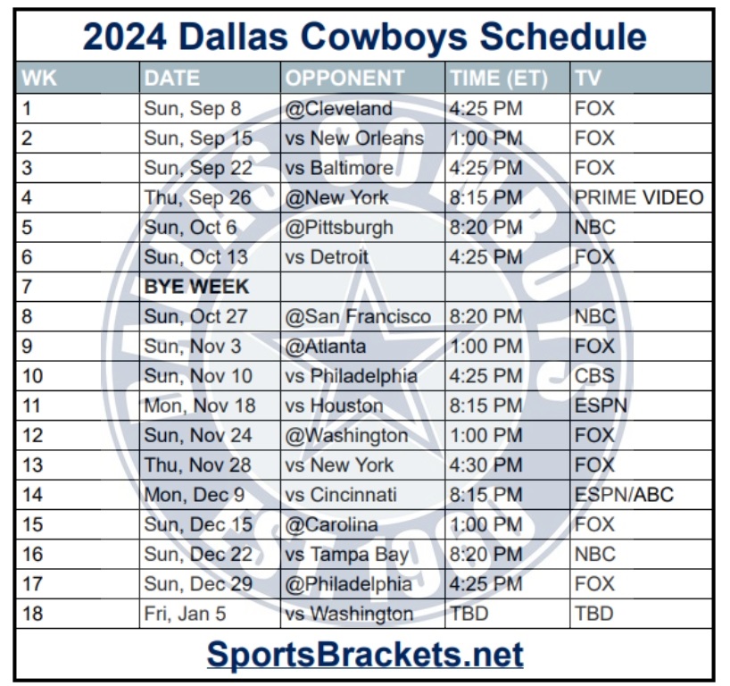 El calendario imprimible de los Dallas Cowboys para 2024 está disponible en formato PDF e imagen. Ya se publicaron todos los enfrentamientos y las transmisiones televisivas de la temporada de 17 juegos. La programación de la semana 18 se definirá en cuanto a los horarios de inicio y las cadenas de televisión para todos los equipos hasta más adelante en la temporada. Los Dallas Cowboys comienzan la temporada el 8 de septiembre como visitantes en Cleveland.
