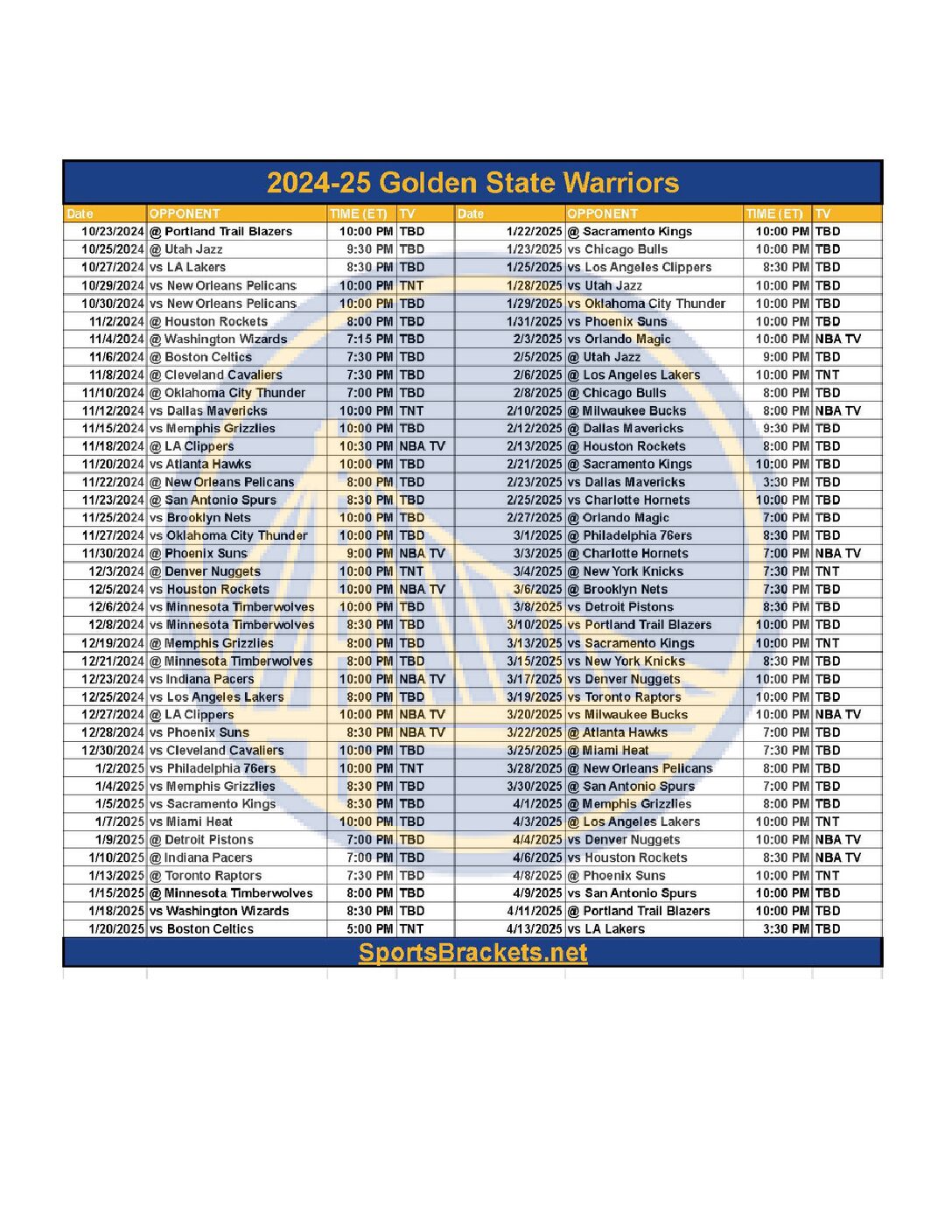 Para aquellos que prefieren una copia impresa, el 2024-25 Guerreros del Estado Dorado El horario está disponible en un horario conveniente. PDF Formato. Esto facilita la descarga, la impresión y el seguimiento de cada partido. Recuerde consultar las actualizaciones de los horarios de los partidos, ya que pueden modificarse durante la temporada.