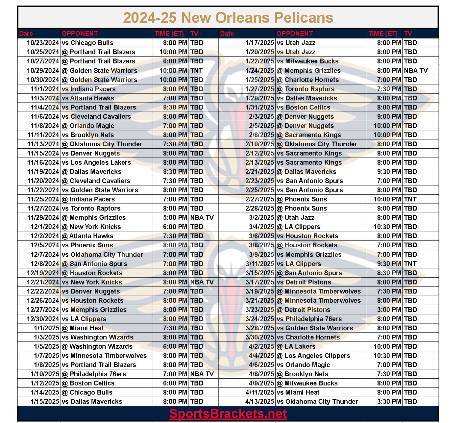 Para aquellos que prefieren una copia física, la edición 2024-25 Pelícanos de Nueva Orleans El horario está disponible en un horario conveniente. Formato PDFideal para descargar, imprimir y seguir cada partido. Asegúrate de estar al día sobre cualquier cambio potencial en los horarios de los partidos durante la temporada.