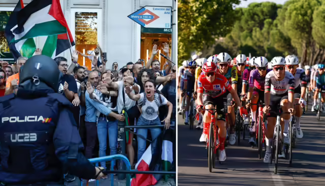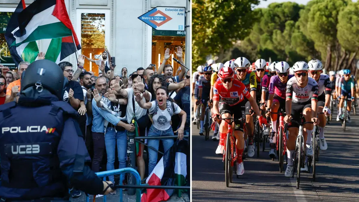 La Situación de la Última Etapa de la Vuelta de España Se complica con la entera invasión de los manifestantes Propalestinos en diversas zonas de las calzadas madrileñas por las que sebe debe transitar el pelotón.