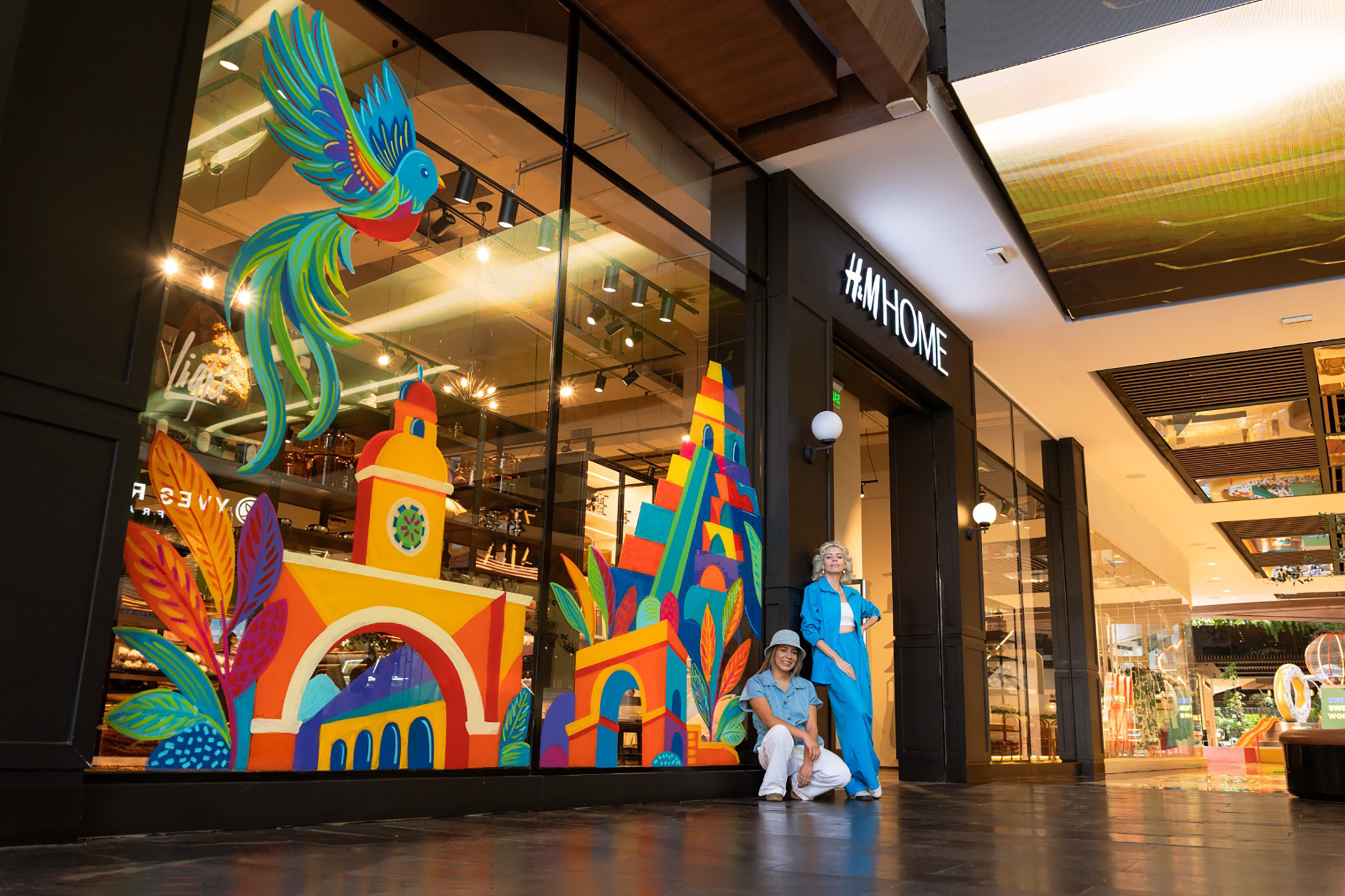 La Reconcida Artista Guatemalteca Mariluz Andrade Piñol Realizó una intervención artística en vivo Acompañada por la Artista Vanessa Peña, Con Quien Dio Vida al Mural en Las Vitrinas de H & M Hogar.