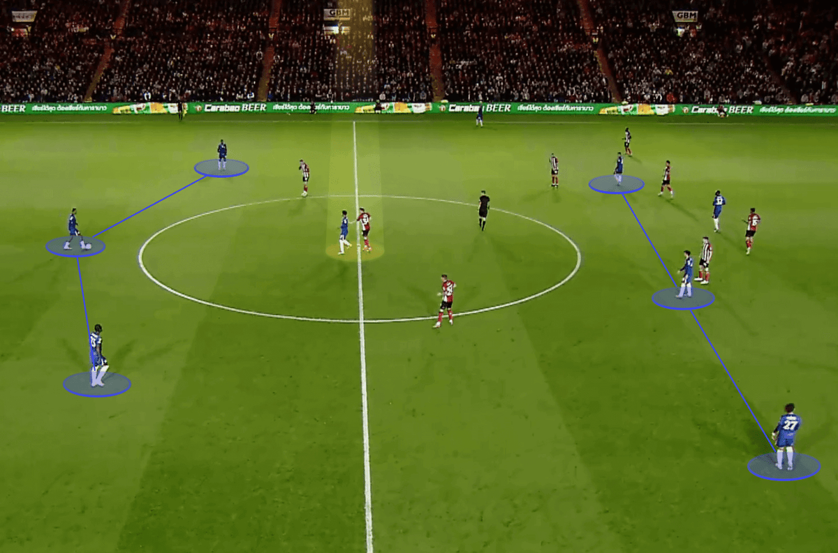 En Brentford, fue una serie de sustituciones de medio tiempo lo que ayudó a cambiar el rumbo. En su primer Premier League de la Premier League, tanto Buonanotte como Jorrel Hato parecían dudas en la deriva demasiado lejos de sus posiciones dentro del marco estructural de Maresca en la primera mitad, lo que facilitaba la oposición bloquear los pases en ellos, como se muestra a continuación.