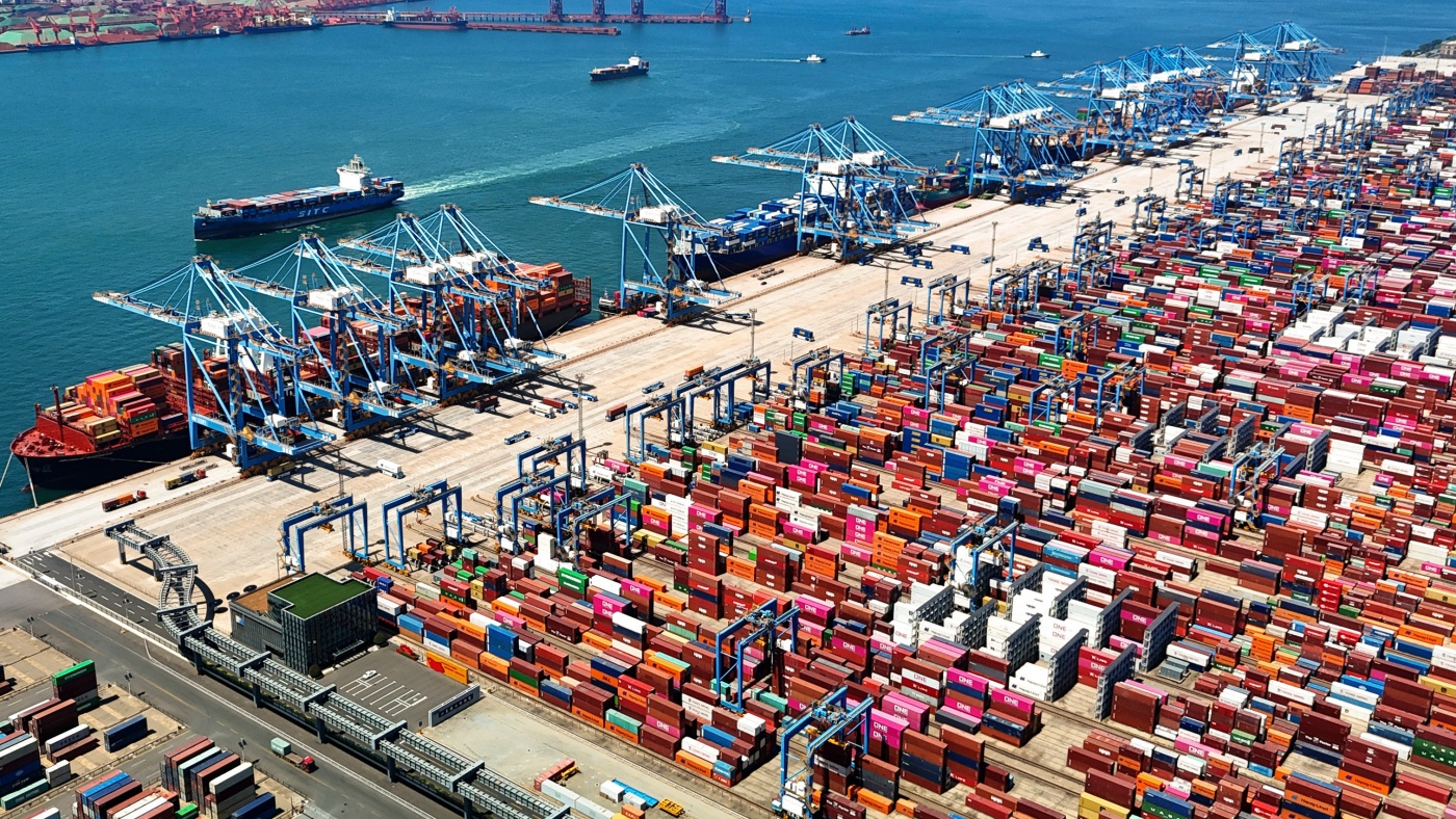 Una vista aérea de un puerto de contenedores en Qingdao, en la provincia de Shandong, en el este de China, el 6 de junio de 2024.