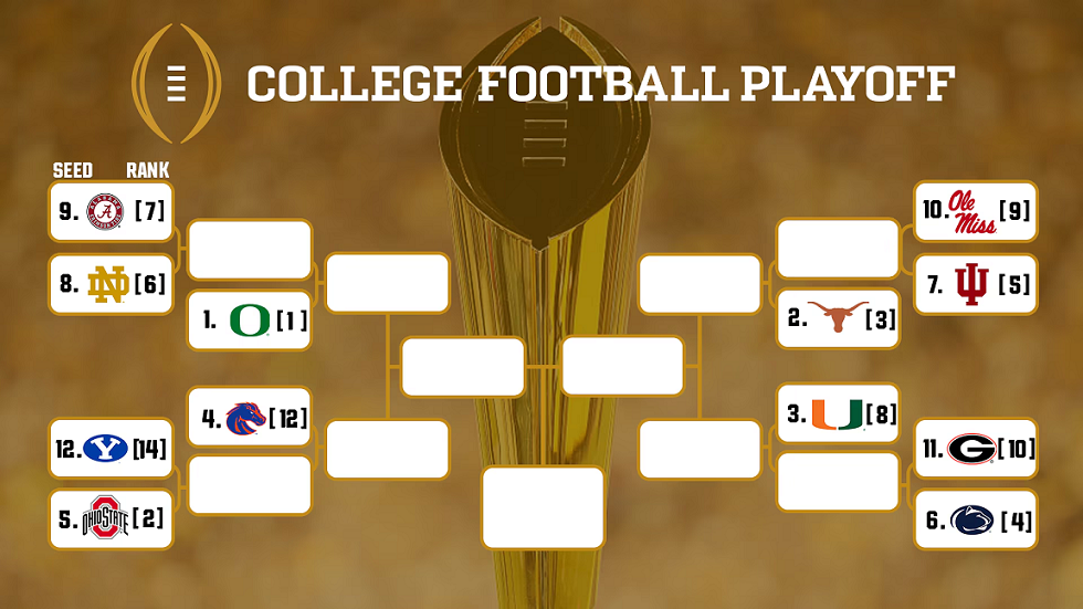 Los cuatro campeones de conferencia de mayor rango obtienen los cuatro primeros puestos en el cuadro de playoffs de fútbol universitario 2024-25. Esta semana se ve un ligero cambio en los cuatro mejores equipos. Ahora tenemos a Boise State en el puesto número 4 con Oregón, Texas y Miami. Así es como se verían los enfrentamientos si los playoffs fueran hoy para el cuadro y calendario de los playoffs de fútbol universitario 2024-25.