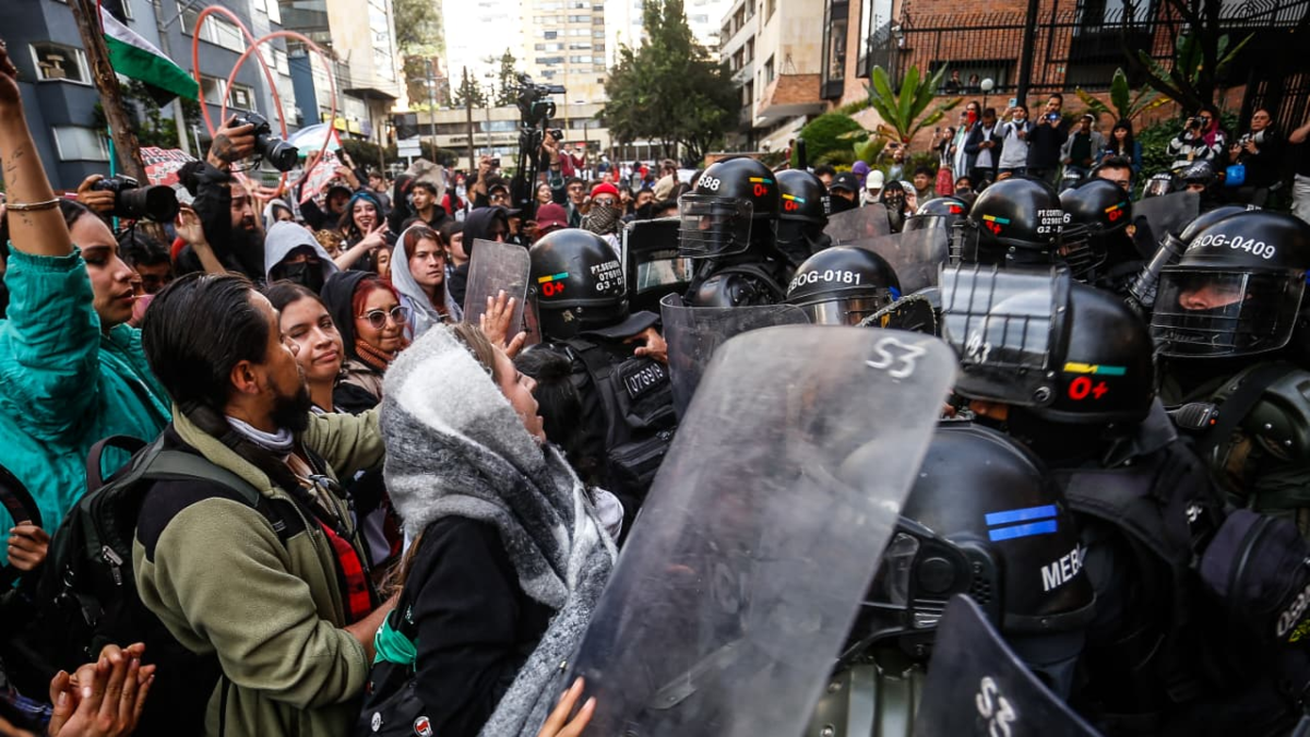 FUERON VARIAS HORAS LAS QE UN GRUPO DE PERSONAS SE MANIFESTÓ FRENTE AL EDIFIO DE LA Asociatura Nacional de Empresaria de Colombia (Andi) en bogotá, en apoyo un los activistas de la flotilla global sumud detenidos por israel en el Mediterráneo. Lo que inició como una protesta por Palestina Terminó en varios perturbaciones contra la fuerza pública.