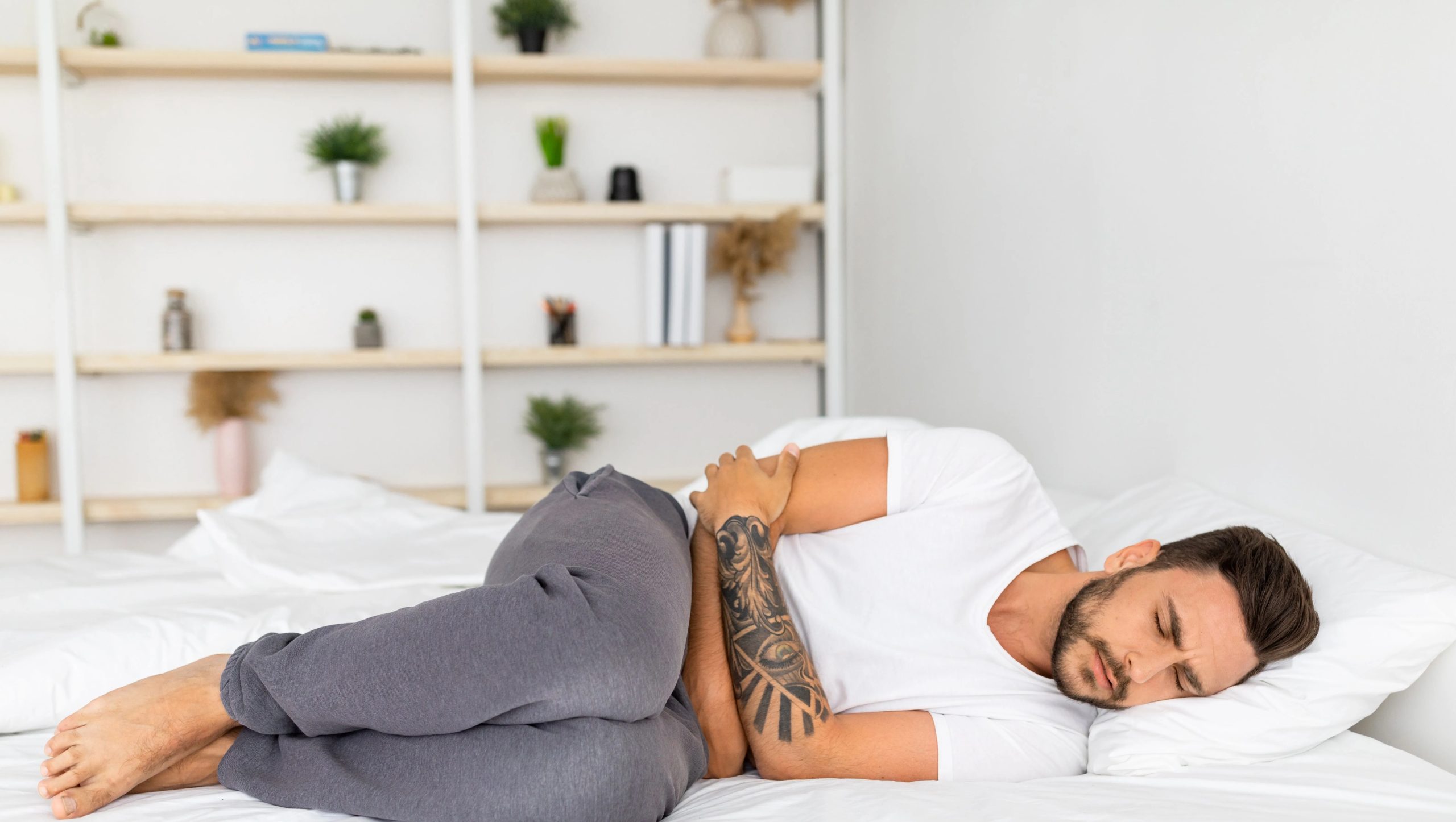 Es posible que pueda deshacerse del gas más rápidamente acostado sobre su estómago. También se ha demostrado que una práctica regular de yoga ayuda a aliviar el dolor relacionado con el IBS, según un estudio publicado en junio de 2025 en el polaco Medical Journal, Przegla̜d gastroenterologiczny. Las posturas como pose para aliviar el viento, la pose del niño y el bebé feliz son fáciles de hacer cuando estás acostado en la cama.