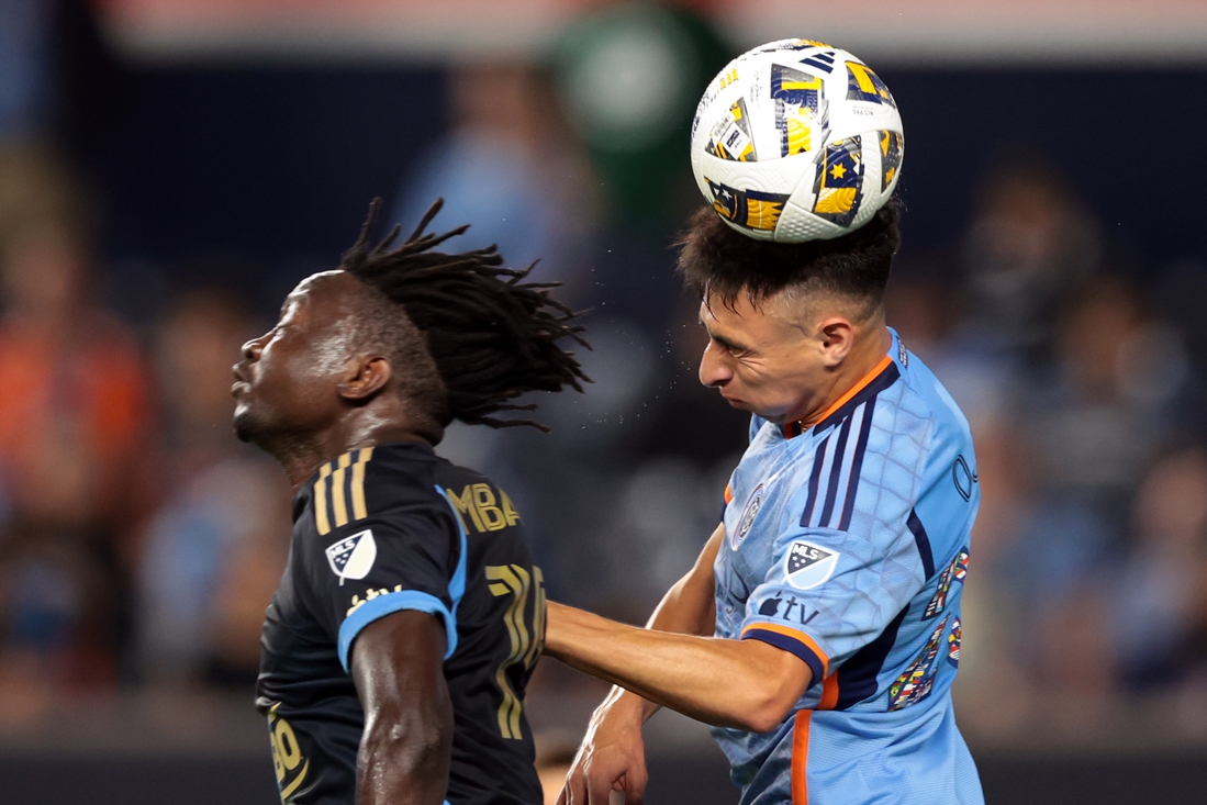 18 de septiembre de 2024; Nueva York, Nueva York, EE. UU.; El delantero del New York City FC, Agustín Ojeda (26), lucha por un cabezazo contra el defensor del Philadelphia Union, Olivier Mbaizo (15), durante la primera mitad en el Yankee Stadium. Crédito obligatorio: Vincent Carchietta-Imagn Images Tai Baribo registró un gol y una asistencia para ayudar al Philadelphia Union a lograr una victoria fundamental por 5-1 sobre el anfitrión New York City FC el miércoles por la noche.