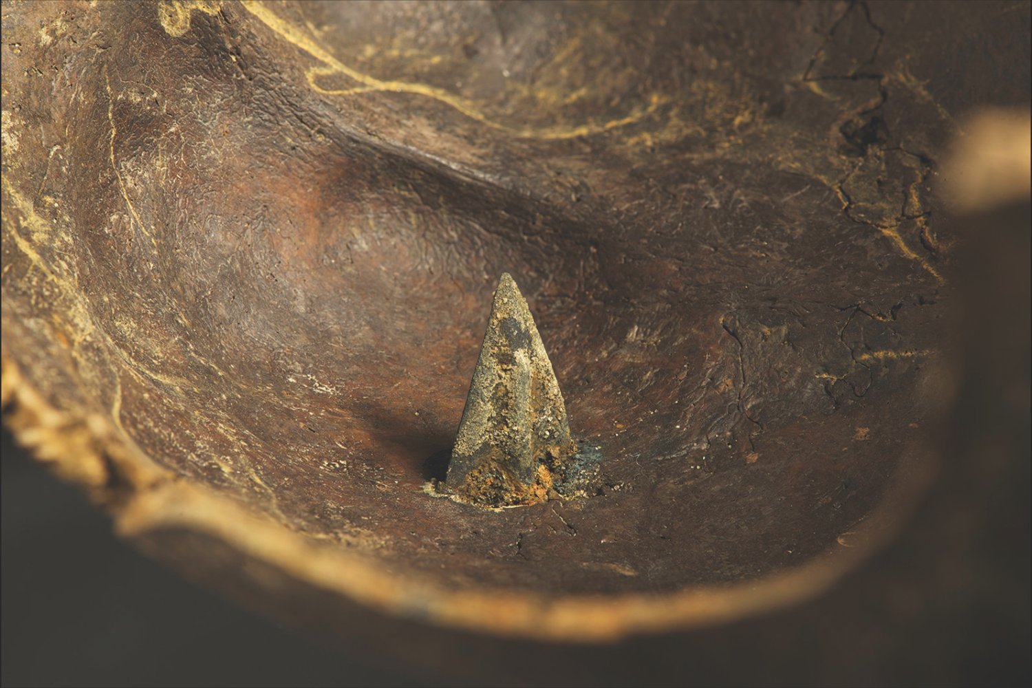 Las puntas de flecha extranjeras no se han encontrado en tumbas de la zona de Tollense, lo que indica que las puntas de flecha de otros lugares no llegaron a la región simplemente a través del comercio. Las púas, al parecer, fueron traídas a Tollense con fines de conflicto. Un conjunto de restos en el sitio lo deja claro: un casquete craneal humano, perforado con una punta de flecha de bronce.