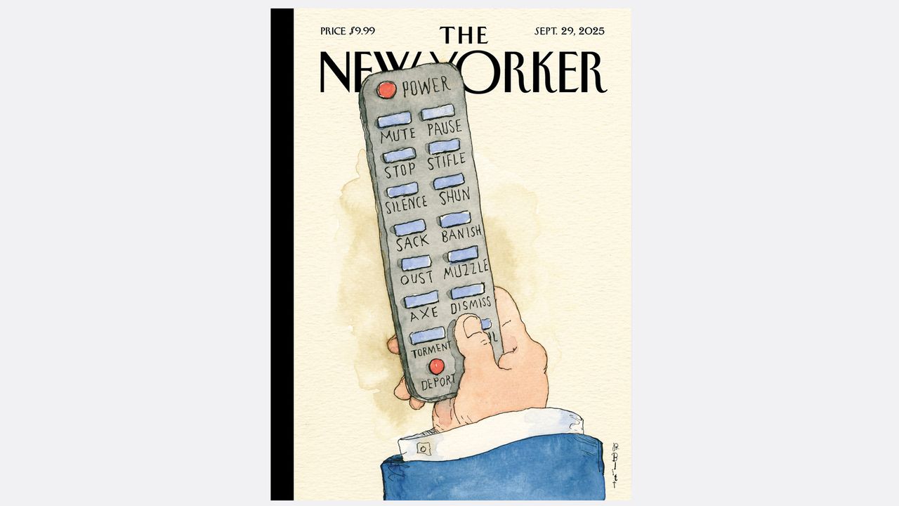 Para la portada del número del 29 de septiembre de 2025, el dibujante Barry Blitt intentó capturar, en una imagen, la serie de ataques sin precedentes de Donald Trump a los medios, destrucción de programas federalesy abusos de poder ejecutivo que han marcado el comienzo de una nueva era de venganza política. «Al votar por el presidente», dijo Blitt, «por supuesto, quiero a alguien que no solo administre el país sino que también ayude a reducir nuestra dieta de los medios».