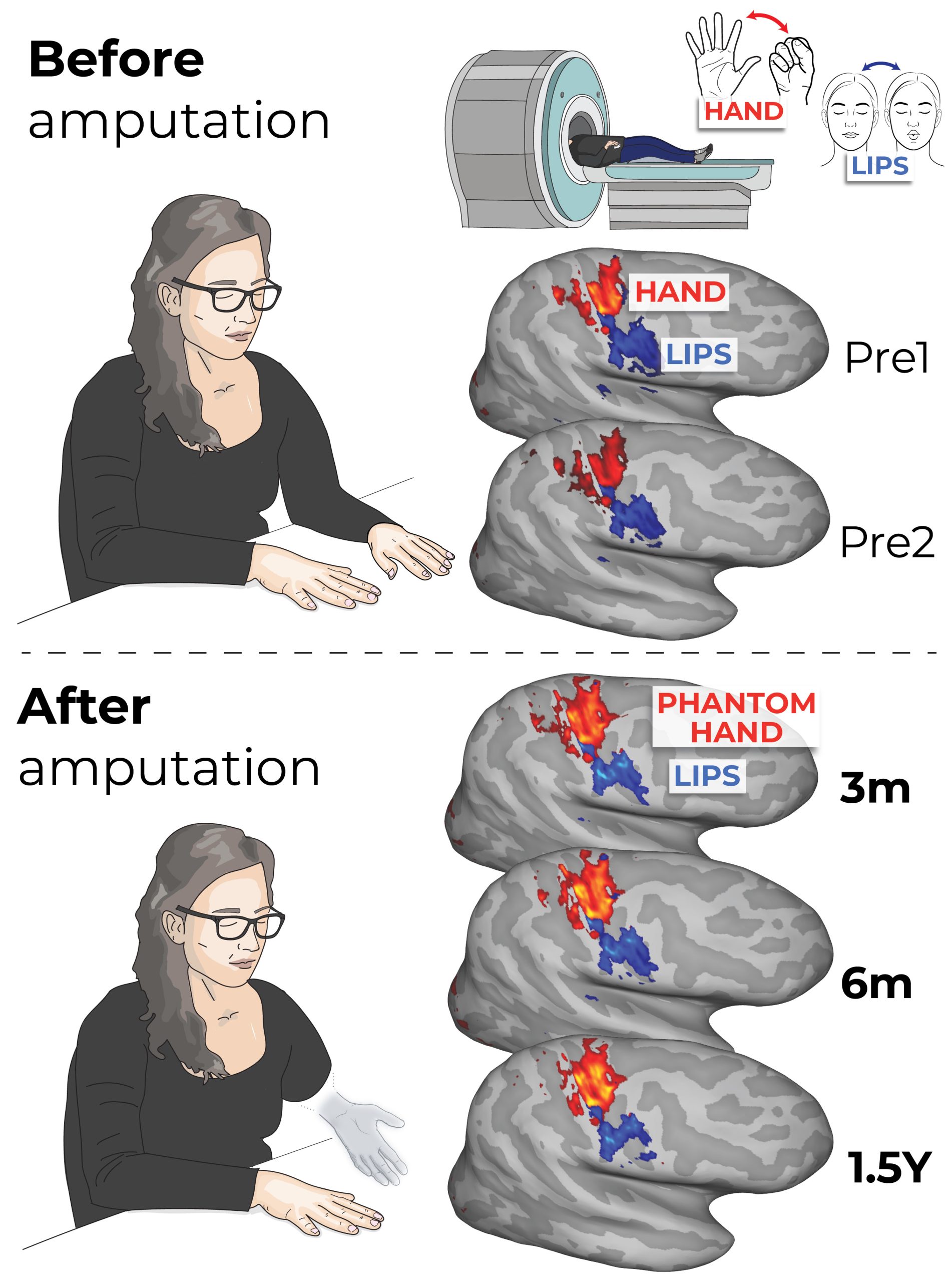 Durante los escaneos de resonancia magnética, los participantes movieron su mano (pre-amputación) o la mano fantasma (post-amputación), así como sus labios (tanto antes como después). Los mapas cerebrales de la mano (rojo) y los labios (azul) se muestran para dos escaneos de pre-amputación (pre1, pre2) y múltiples puntos de tiempo posterior a la amputación: 3 meses, 6 meses y 1,5 años. Los mapas se ven igual en cada punto de tiempo que demuestran la estabilidad del mapa corporal del cerebro después de la amputación.