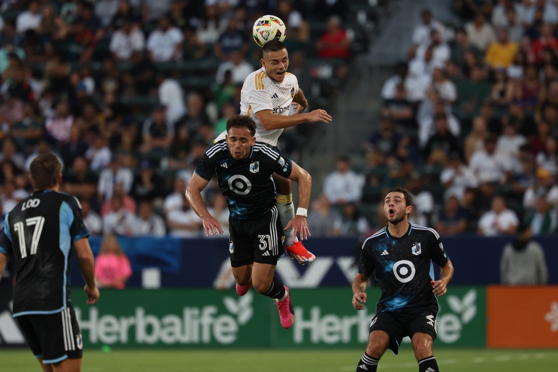 MLS: Minnesota United en LA Galaxy7 de julio de 2024; Carson, California, EE. UU.; El delantero de Los Angeles Galaxy, Dejan Joveljic (9), cabecea el balón sobre el mediocampista de Minnesota United, Hassani Dotson (31), en la primera mitad en Dignity Health Sports Park. Crédito obligatorio: Kiyoshi Mio-USA TODAY Sports