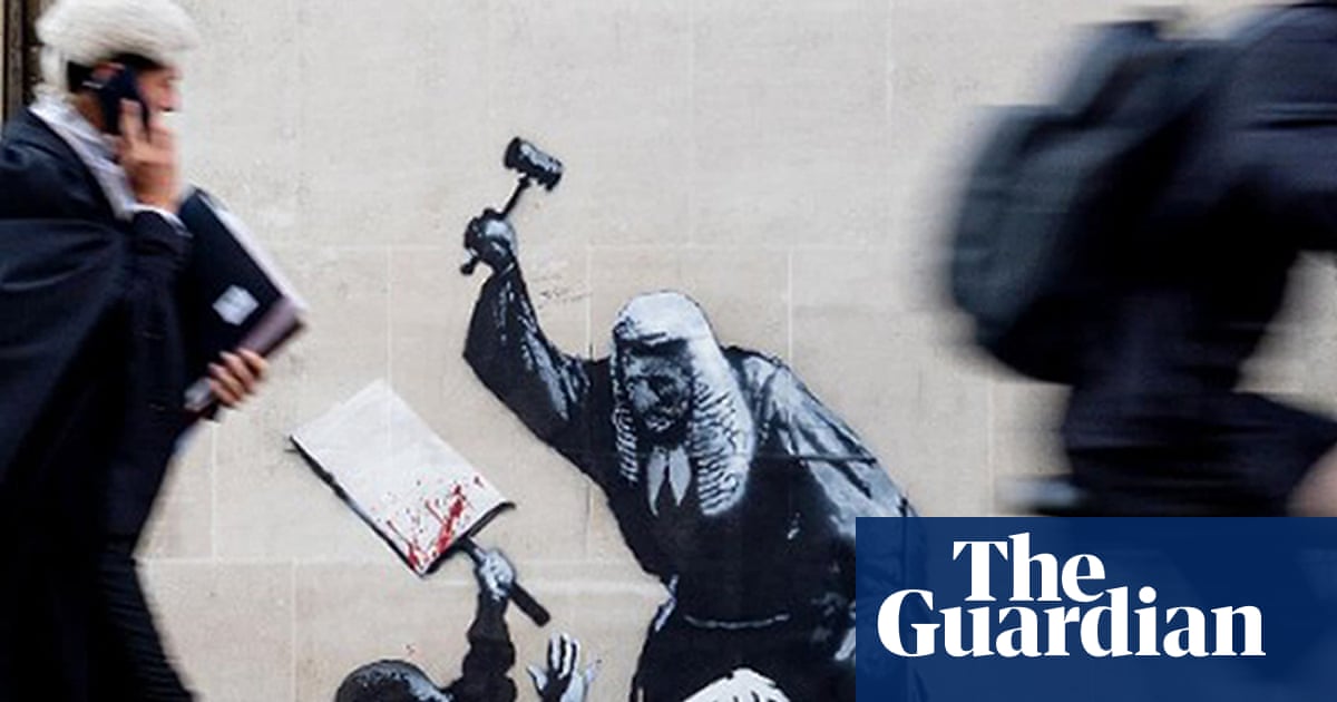 Una pintura de Banksy de un juez que usa un mazo para vencer a un manifestante indefenso apareció en las paredes de los Tribunales Reales de Justicia en Londres Antes de ser cubierto rápidamente por los guardias.