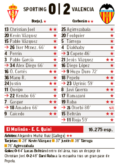 La ficha del partido Sporting – Valencia.