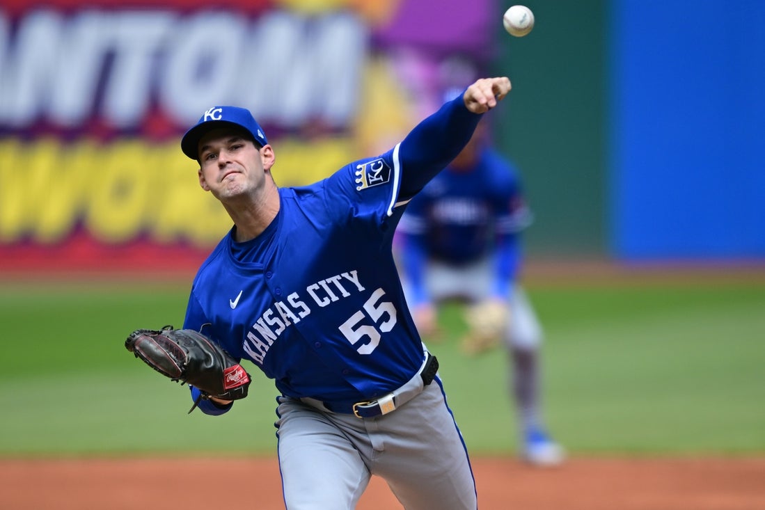 13 de abril de 2025; Cleveland, Ohio, EE. UU.; El lanzador titular de los Reales de Kansas City, Cole Ragans (55), lanza un lanzamiento durante la primera entrada contra los Guardianes de Cleveland en Progressive Field. Crédito obligatorio: Imágenes de David Dermer-Imagn Cole Ragans ha sido el líder de ponches de la liga mayor en las primeras semanas de la temporada. El zurdo de los Reales de Kansas City buscará ofrecer otra actuación abrumadora en los Tigres de Detroit el viernes por la noche.