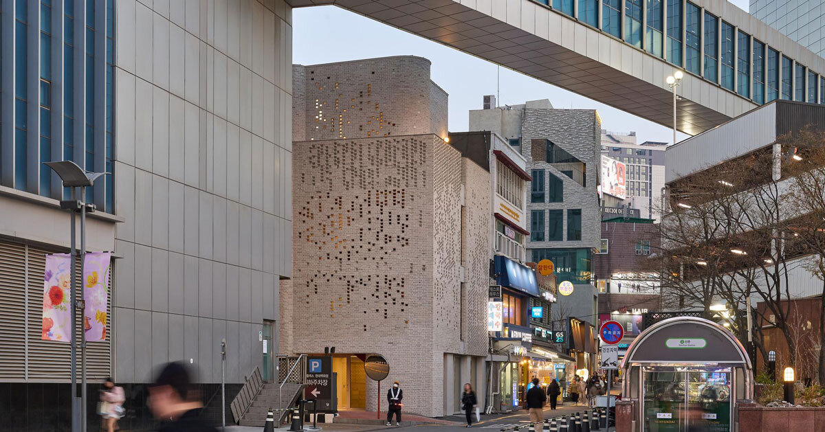 Sinchon se asoció históricamente con la cultura juvenil, la música en vivo y los negocios independientes, pero con el tiempo, estas cualidades disminuyeron con la gentrificación y el dominio de las grandes franquicias comerciales. El proyecto apuntó no solo a estabilizar la estructura sino también a volver a participar con esta historia cultural. El nuevo diseño equilibra consideraciones prácticas con gestos simbólicos. La fachada de ladrillo perforada permite que el edificio cambie visualmente entre el día y la noche, absorbiendo la luz durante el día y emitiendo un brillo suave después del anochecer. Este doble rol subraya la intención del proyecto de combinar la funcionalidad con la referencia cultural.