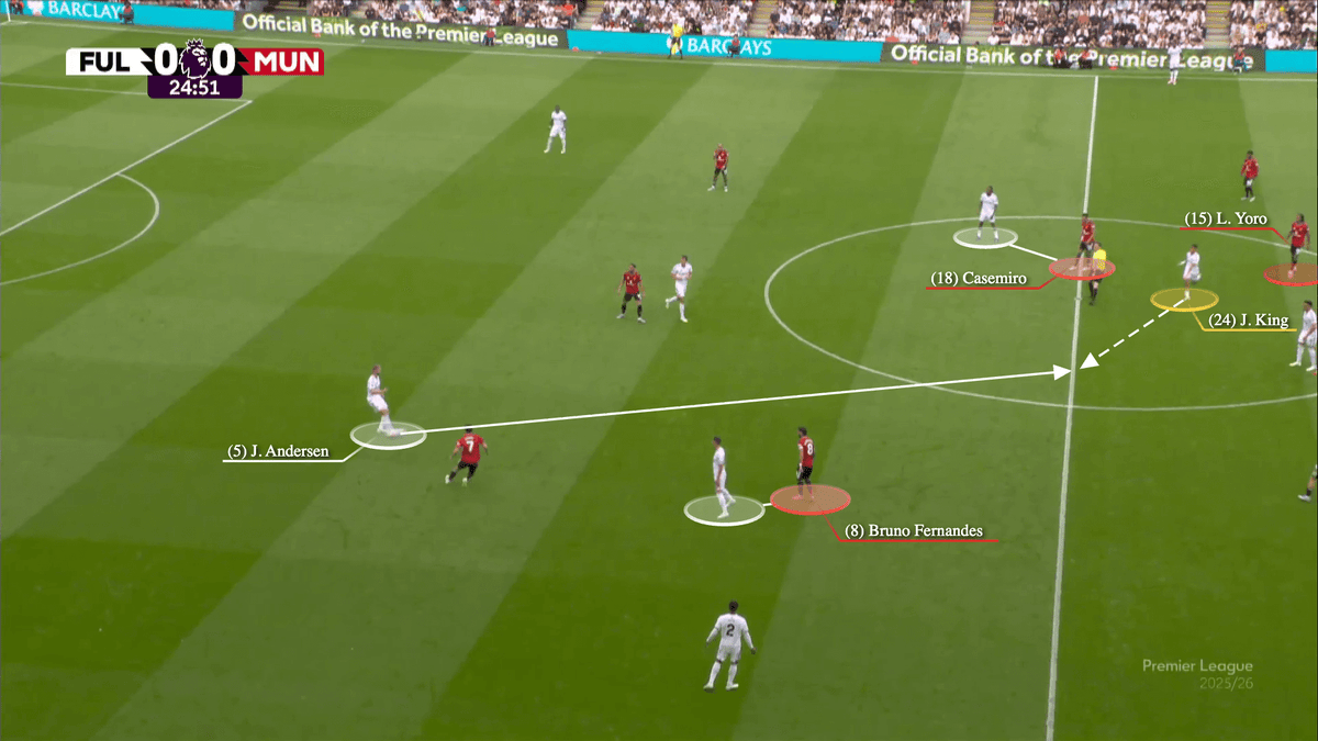 En el ejemplo a continuación, Andersen puede progresar libremente como resultado, y con Bruno Fernandes y Casemiro marcando a Sasa Lukic e Iwobi, Joshua King puede dejar y atacar el espacio detrás del centro del campo de United, con Yoro no cometiendo y Shaw reaccionando tarde.