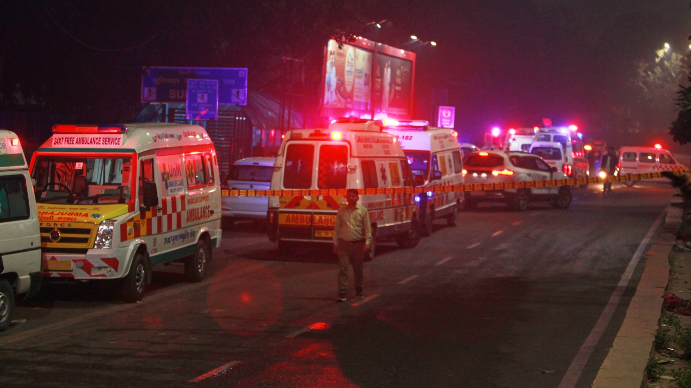 Las ambulancias están alineadas en el lugar después de la explosión de un automóvil cerca del histórico Fuerte Rojo en Nueva Delhi, India, el lunes.