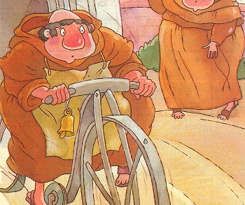 Había un frágil que se pasaba vueltas a la chocolatera todo el día. Hacía chocolate de almendras. Este era fray Cucufate, el del chocolate. Fray Pirulero, el cocinero, era regordete y colorado, como todos los cocineros, y tenía los pies anchos. Andaba de lado, como los patos, y tenía un gorro blanco en la cabeza. Pues déjate que fray Mamerto, el del huerto, ¡pasaba con cada brazada de zana horias!… ¡Con lo que le gustaban a San Francisco las zanahorias!