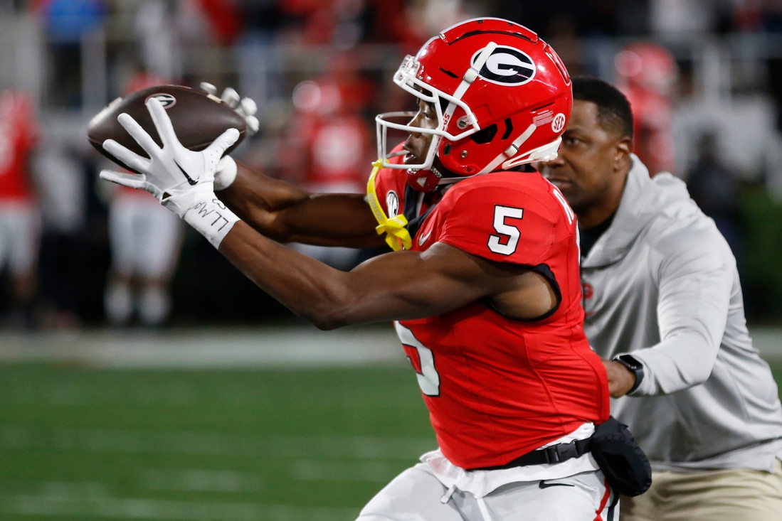 El receptor abierto de Georgia, Rara Thomas (5), realiza una atrapada durante los calentamientos antes del inicio de un partido de fútbol americano universitario de la NCAA contra Ole Miss en Athens, Georgia, el sábado 11 de noviembre de 2023. Georgia despidió al receptor abierto senior Rodarius «Rara» Thomas del equipo luego de su arresto la semana pasada por un delito grave de crueldad infantil en segundo grado y un delito menor de agresión.