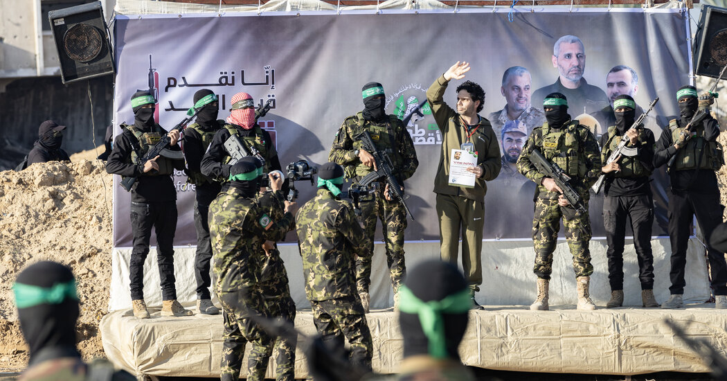 Los combatientes de Hamas transfiren Yarden Bibas a la Cruz Roja en Khan Younis, Gaza, el sábado.Crédito…Saher Alghorra para el New York Times