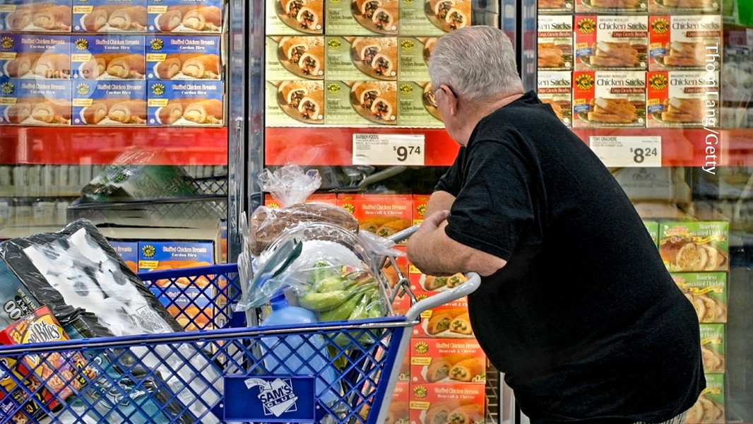 Un hombre de sobrepeso senior empujando una carro en un supermercado pasado de congeladores llenos de comidas listas y alimentos procesados