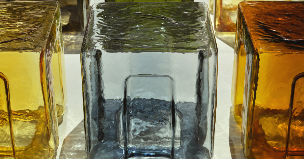Los objetos funcionales por diseño marca 6: AM son cubos de vidrio soplado, cada uno único en tono y detalle de superficie, y la paleta de colores del estudio de diez tonos incluye verde, ámbar, transparente, gris y violeta, por nombrar algunos. No se destaca la sombra, pero brillan en armonía, incluso refractando la luz y jugando con sombras para imitar la superficie del mar y las olas del océano. En una mirada más cercana, la parte superior de estos taburetes de vidrio de Murano en el verano de Bottega Veneta 2026 espectáculo refleja la calma del mar, lejos de la turbulencia.