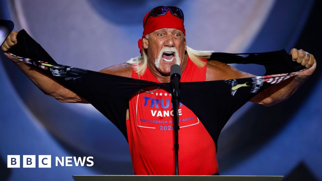 Imágenes GettyLa leyenda de la lucha libre Hulk Hogan bromeó sobre golpear con el cuerpo a la vicepresidenta Kamala Harris frente a una multitud entusiasmada y cuestionó su identidad racial.