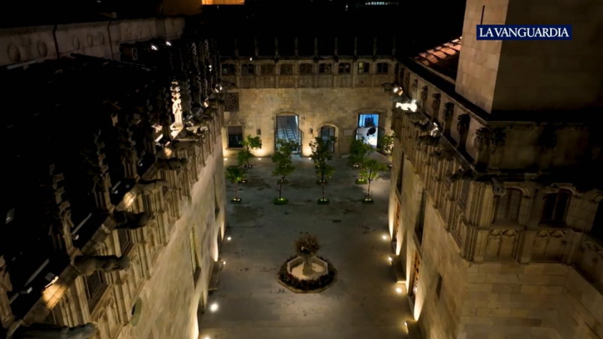 El presidente Illa, junto a la senyera y el árbol de Navidad de la galería gótica, en su discurso institucional del día de Sant Esteve desde el Palau de la Generalitat