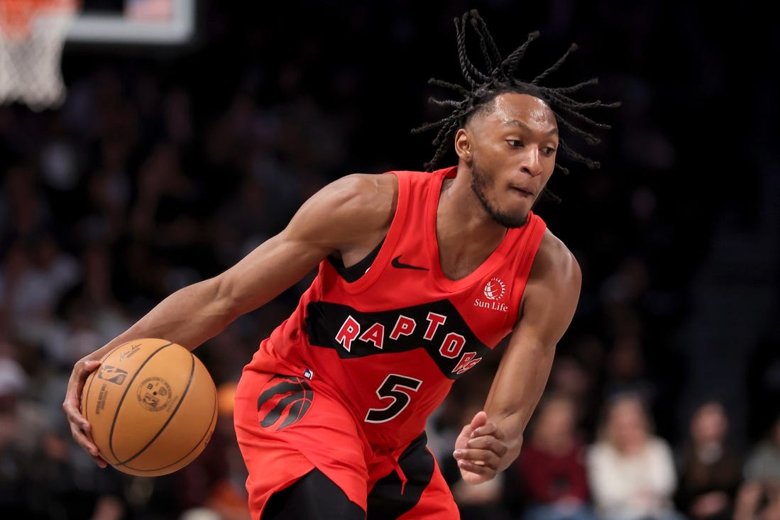 10 de abril de 2024; Brooklyn, Nueva York, Estados Unidos; El guardia de Toronto Raptors Immanuel Quickley (5) maneja el balón contra los Brooklyn Nets durante el cuarto cuarto en el Barclays Center. Crédito obligatorio: Brad Penner-USA TODAY Sports Los Toronto Raptors están recontratando al base Immanuel Quickley con un contrato de cinco años y $175 millones, informó ESPN el viernes.