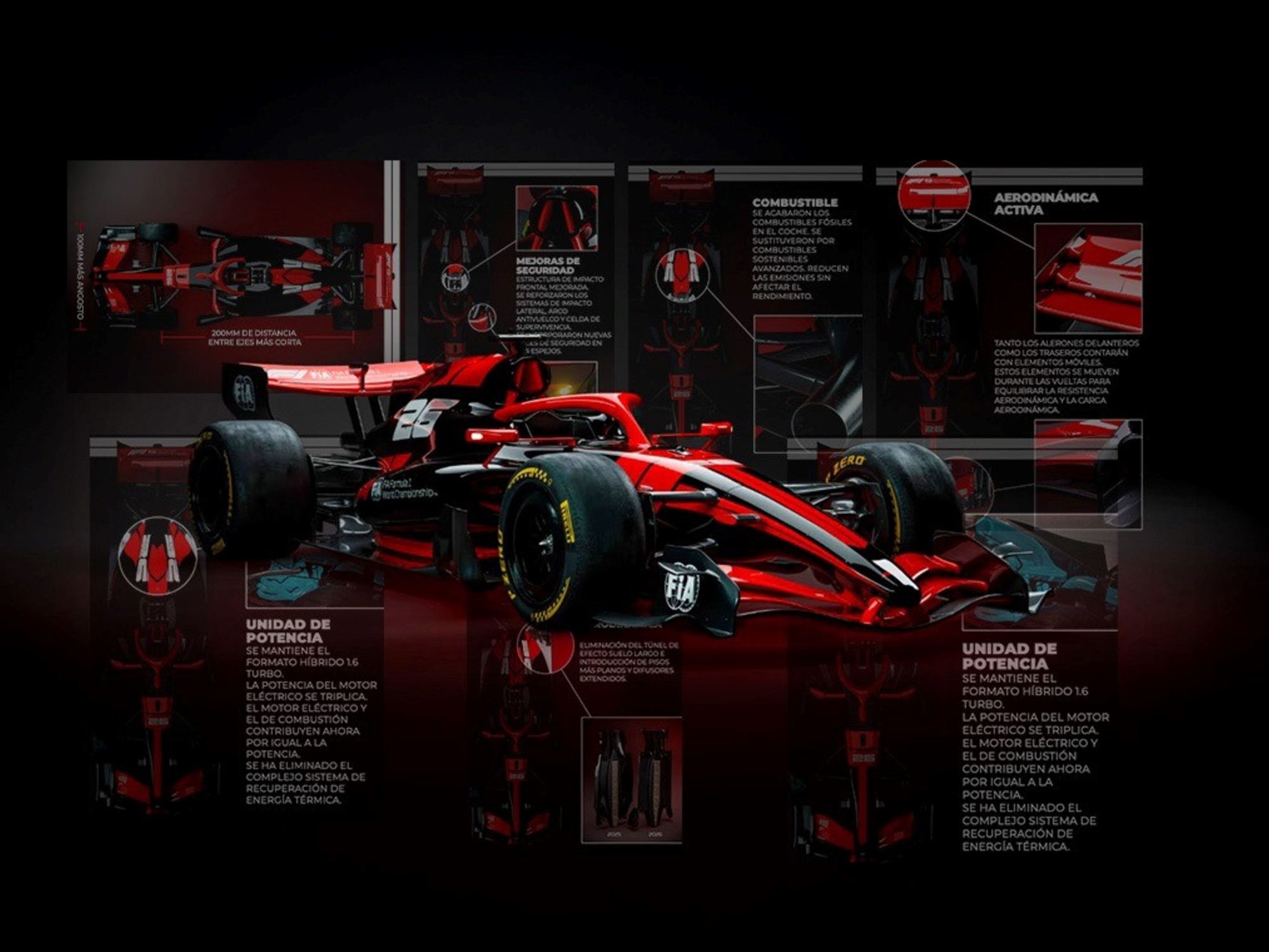 Aerodinámica activa: Los alerones delanteros y traseros móviles reemplazarán al sistema DRS, con configuraciones de alta y baja carga aerodinámica, permitiendo mayor agarre y velocidad cuando el piloto más lo necesite.