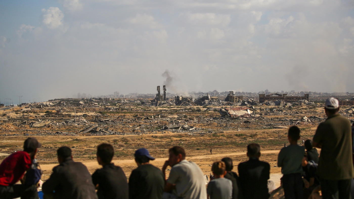 Los palestinos miran hacia la ciudad de Gaza desde Nuseirat, en el centro de la Franja de Gaza, el viernes. La agencia de defensa civil de Gaza dijo el viernes que las fuerzas israelíes han comenzado a retirarse de partes del territorio, particularmente en la ciudad de Gaza y Khan Younis.