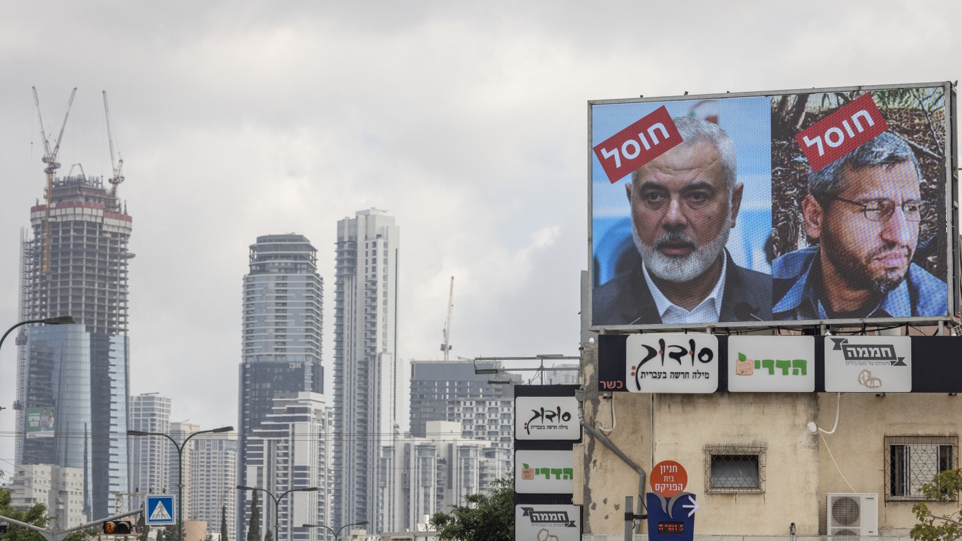 Una cartelera muestra retratos de los líderes de Hamas Mohammed Deif e Ismail Haniyeh con la palabra «asesinado» en hebreo, en Tel Aviv, el 2 de agosto de 2024.